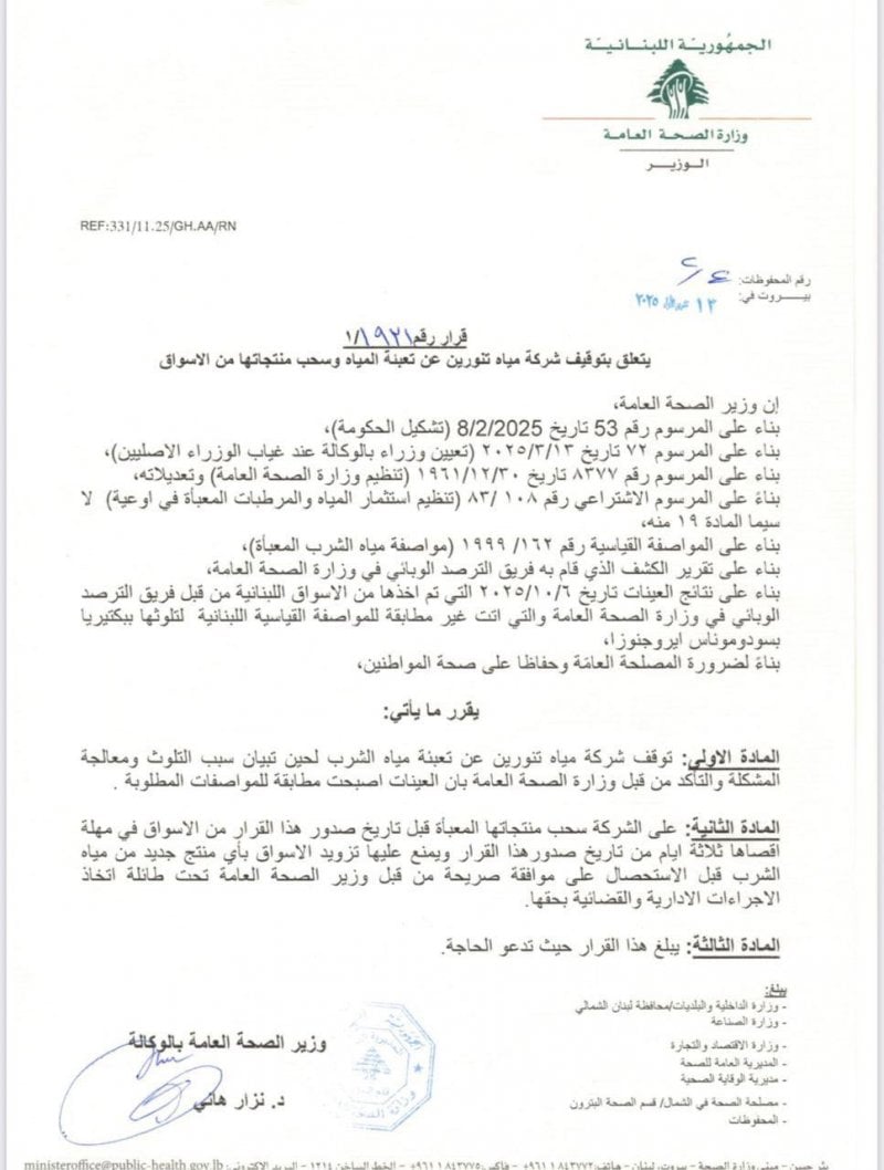 وأضاف هاني أن “القرار كان متخذًا من قبل، بعد إجراء فحوصات مخبرية لعدد من الشركات الخاصة بتوزيع المياه المعدنية الصالحة للشرب، وقد استُلمت العينات في 2 تشرين الأول 2025، وأُصدرت النتائج في 7  تشرين الأول.